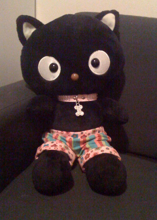 In other news, I found Chococat hanging out on the couch in kidlet's playroom. I really dig the outfit kidlet put on him - pink rhinestone pleather collar and tight, striped-pink shorts.
